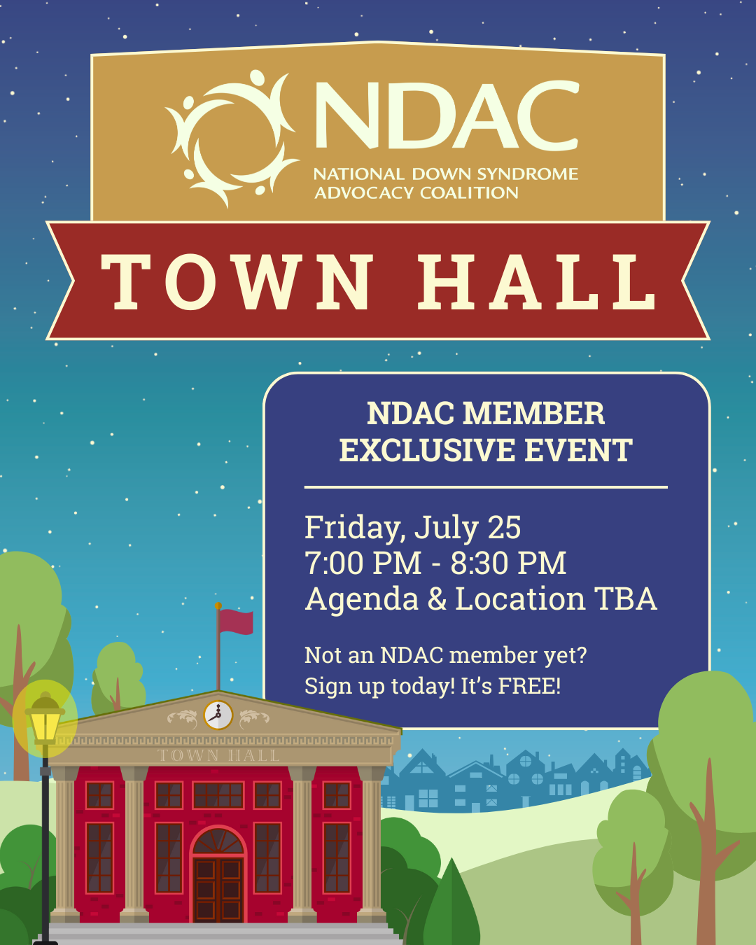 | NDAC Town Hall Sponsored by: Microsoft You’re Invited: NDAC Town Hall at the NDSC Convention National Down Syndrome Advocacy Coalition (NDAC) Members are invited to join us for the NDAC Town Hall at the NDSC Convention Friday, July 25, 7:00 – 8:30 PM. This exclusive, NDAC members-only event offers a rare chance to connect face-to-face with fellow NDAC advocates in a small, focused setting. We’ll share updates, strategy, and inspiration to strengthen our advocacy efforts nationwide. Not an NDAC member yet? It’s easy to join — online or at the door. All are welcome, and if needed, bring your children.