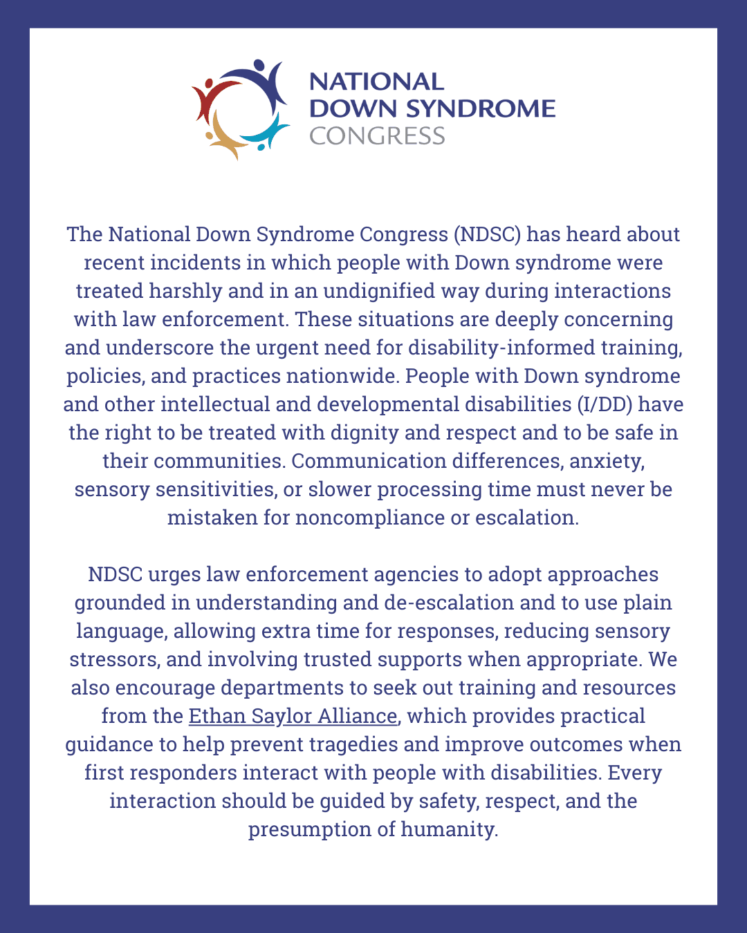 NDSC urges law enforcement agencies to adopt approaches grounded in understanding and de-escalation and to use plain language, allowing extra time for responses, reducing sensory stressors, and involving trusted supports when appropriate. We also encourage departments to seek out training and resources from the Ethan Saylor Alliance, which provides practical guidance to help prevent tragedies and improve outcomes when first responders interact with people with disabilities. Every interaction should be guided by safety, respect, and the presumption of humanity.