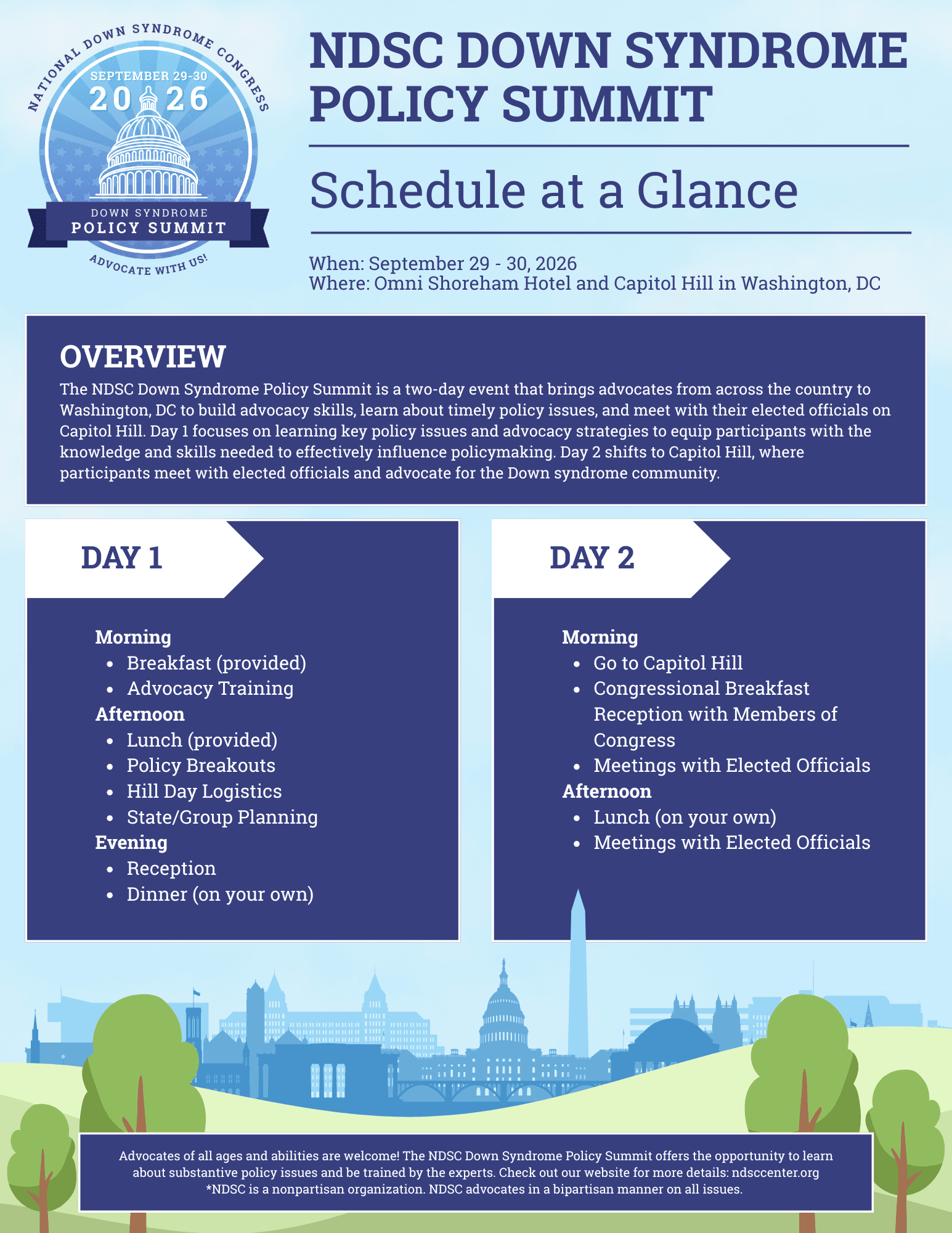 Our Schedule at a Glance provides a peek into the NDSC Down Syndrome Policy Summit. Click the button below to download the 2026 Schedule at a Glance.
