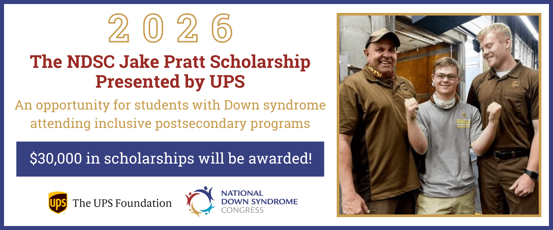 The NDSC Jake Pratt Scholarship presented by UPS will provide individual scholarships to people with Down syndrome who are currently enrolled or accepted in an inclusive postsecondary education program that will enhance their life through employment, independent living, life skills, or interests in any other areas. This is the 3rd cycle of scholarships and will provide (5) $5,000 scholarships and (5) $1,000 scholarships for a total of $30,000.